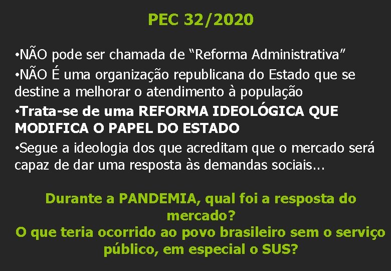 A sociedade brasileira será muito prejudicada se esta pec 32. A proposta de emenda à constituição nº32/2020, conhecida como reforma administrativa, está sendo discutida e em breve será votada no .